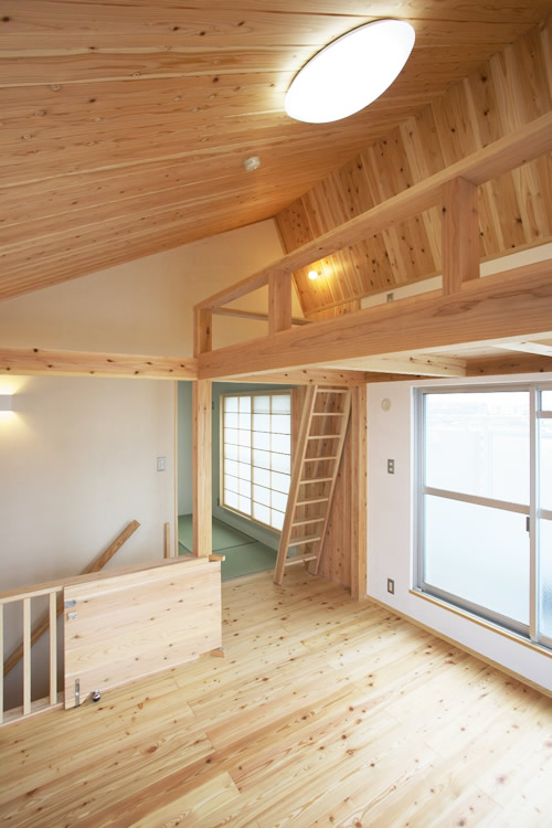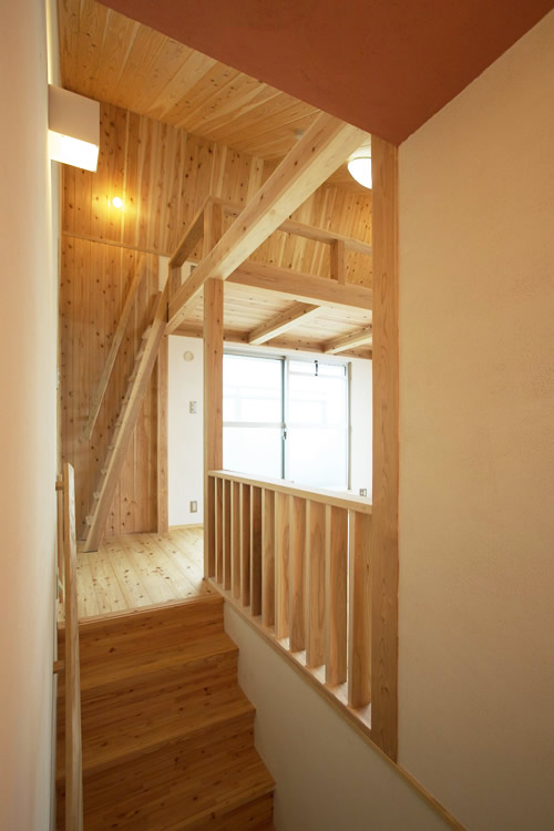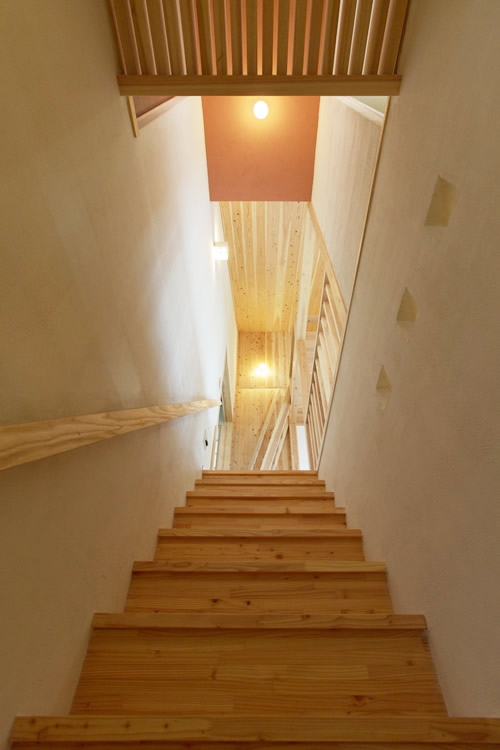 家族のアレルギー症状が和らぐように、壁や天井にはサメジマの珪藻土をパターンを変え随所に塗っており、他にも無垢材や和紙など自然素材を多用した室内には、自然と落着ける心地良い空気が漂っているようです。また6階の西側屋上には貸切の広いバルコニーが設けてあり、将来的に緑化を施せば庭付きの佇まいに変わります。夏は夕日を眺めながらビールもすすむ最高のステージとなりそうです!