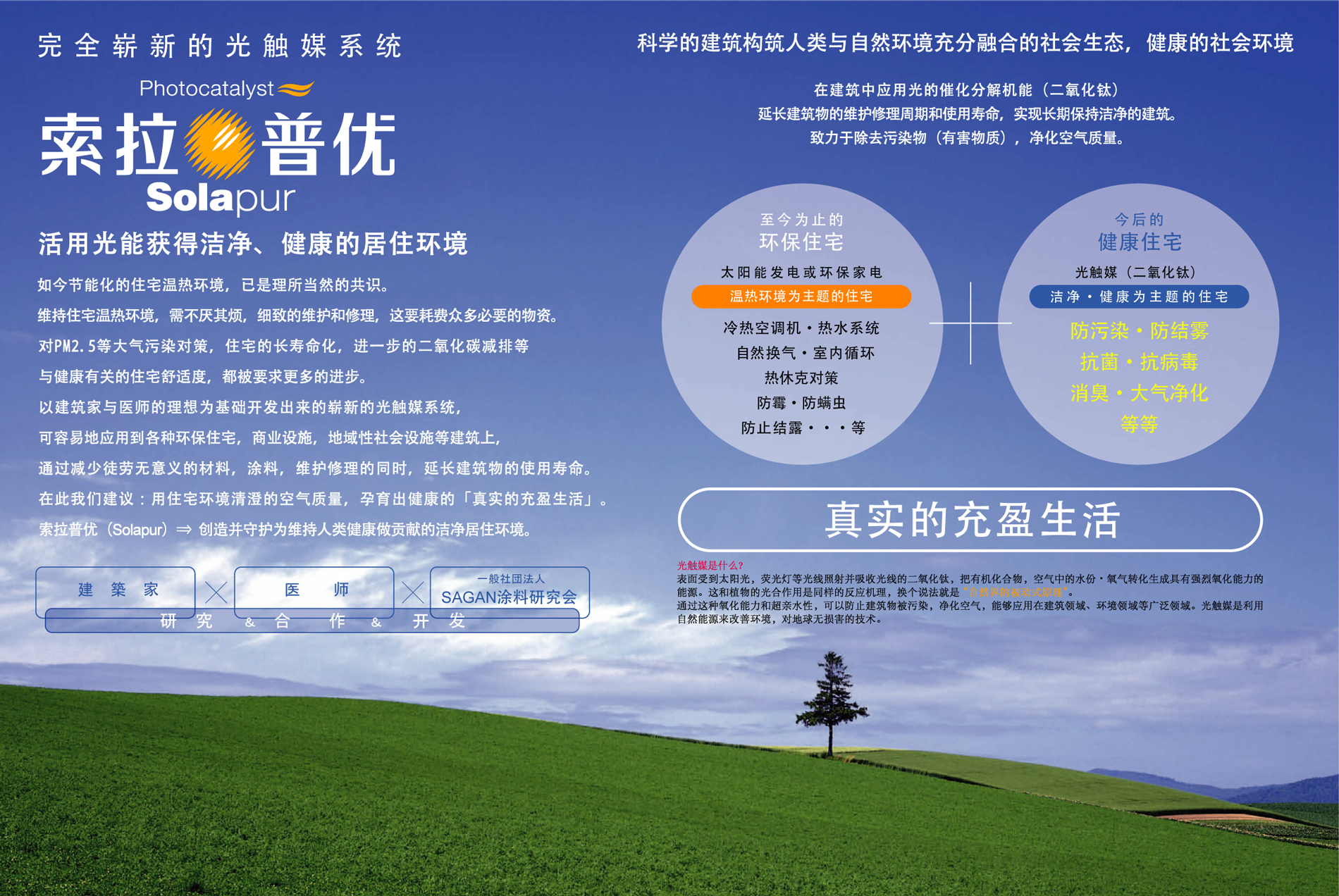 - 以前的光触媒商品对于室内光线不会进行应答,但索拉普优即使实在室内也可以对光线做出应答。根据(可视光应答型光触媒)充分发挥其光触媒功能。