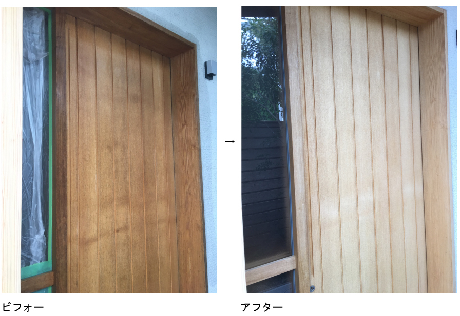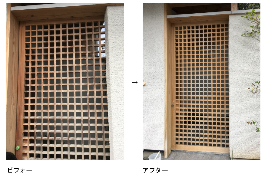 また木部は水ペーパーで表面を研磨し、カビ取り材で除去し、木肌美人を塗布しております。