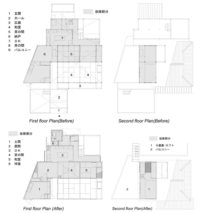 100年以上経った民家の再生改造工事です。以前から使われていなかった小屋裏の空間を再利用し、茶の間の天井を抜いて上部から光を取り込みました。昔の小屋組みなど木構造を現した大空間の空調は、床暖房で補っています。