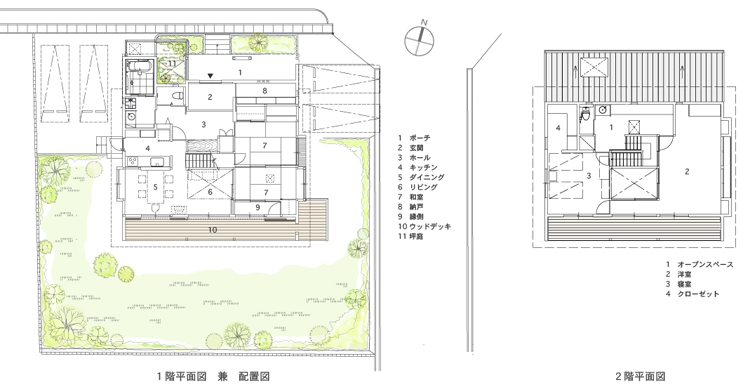 南側全面に大きく木製窓を設け、光や風を最大限に採り入れます。採光・通風の少ない北側の部屋のため大屋根上部にハイサイドライトを設け、明るさと夏場の風通しを考慮しました。リビング上部の吹抜けや南側のウッドデッキなどタテやヨコのつながりが開放感を生み出す、居心地の良い住まいです。